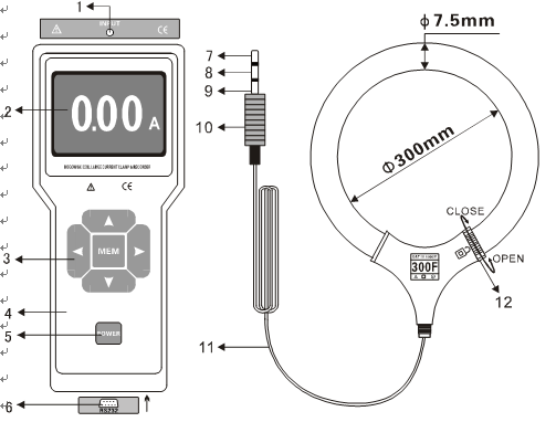 3) 当被测电流较小时,可通过把柔性线圈在被测导线上反复环绕多圈后再闭合起来提高测试分辨率。例如:被测电流为10mA,把柔性线圈在被测导线上环绕3圈后,测试仪表显示30mA,环绕5圈则显示50mA,以此类推,实际电流等于仪表显示值除以柔性线圈绕的圈数。参考图例见后。