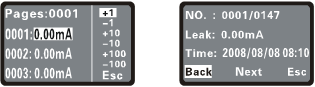 在查询界面下按向左、向右箭头键能移动光标。光标定位在第几组记录值时按MEM键,能详细显示该组记录值的信息,包括第几组/已存组数、电流值大小、记录时间等。