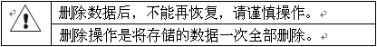 在测试状态下,按MEM键进入功能目录,按向上、向下箭头键移动光标到“删除数据"项,再按MEM键即进入删除数据提示,光标在“确定"位时按MEM键即删除已存数据,光标在“取消"位时按MEM键不删除,返回上级目录。