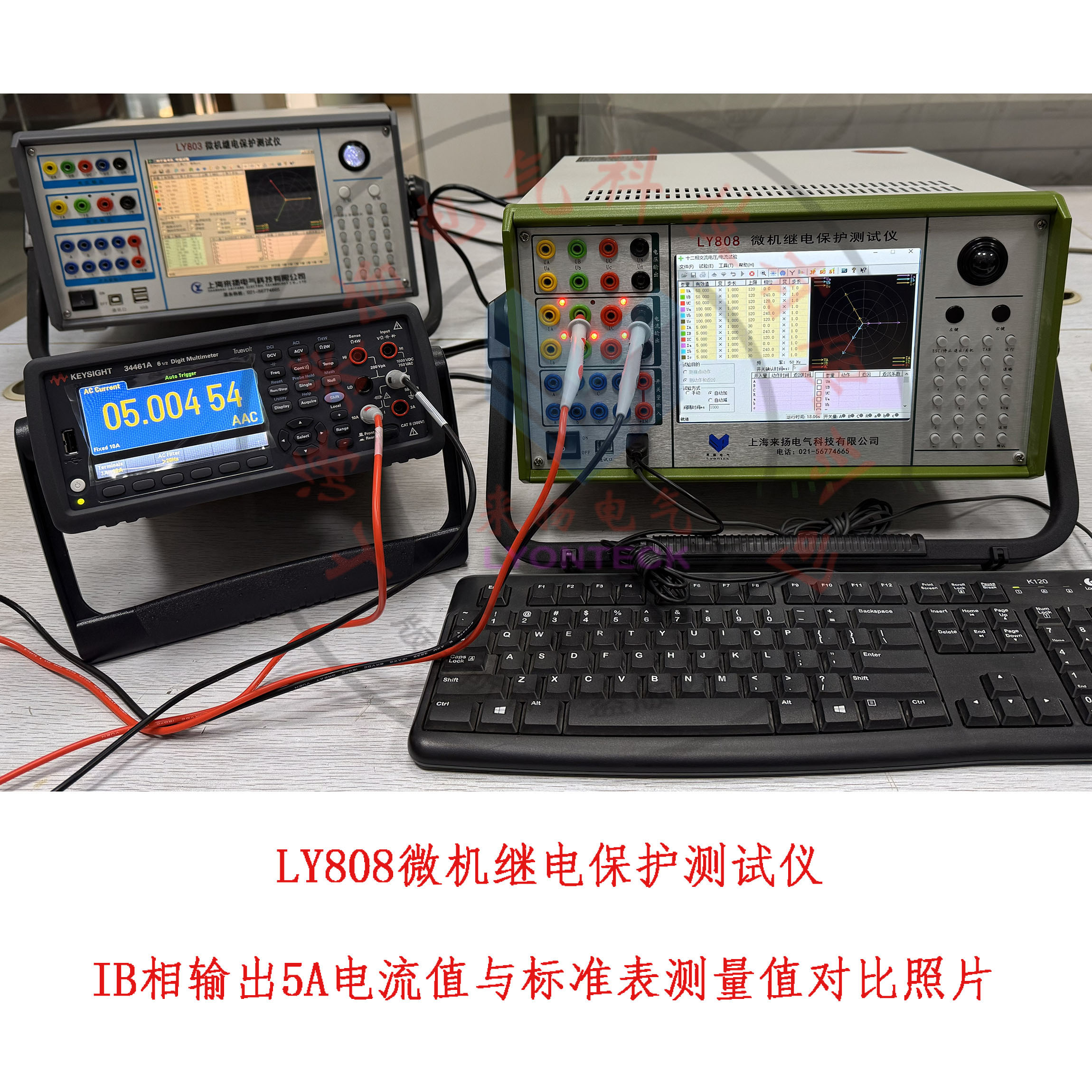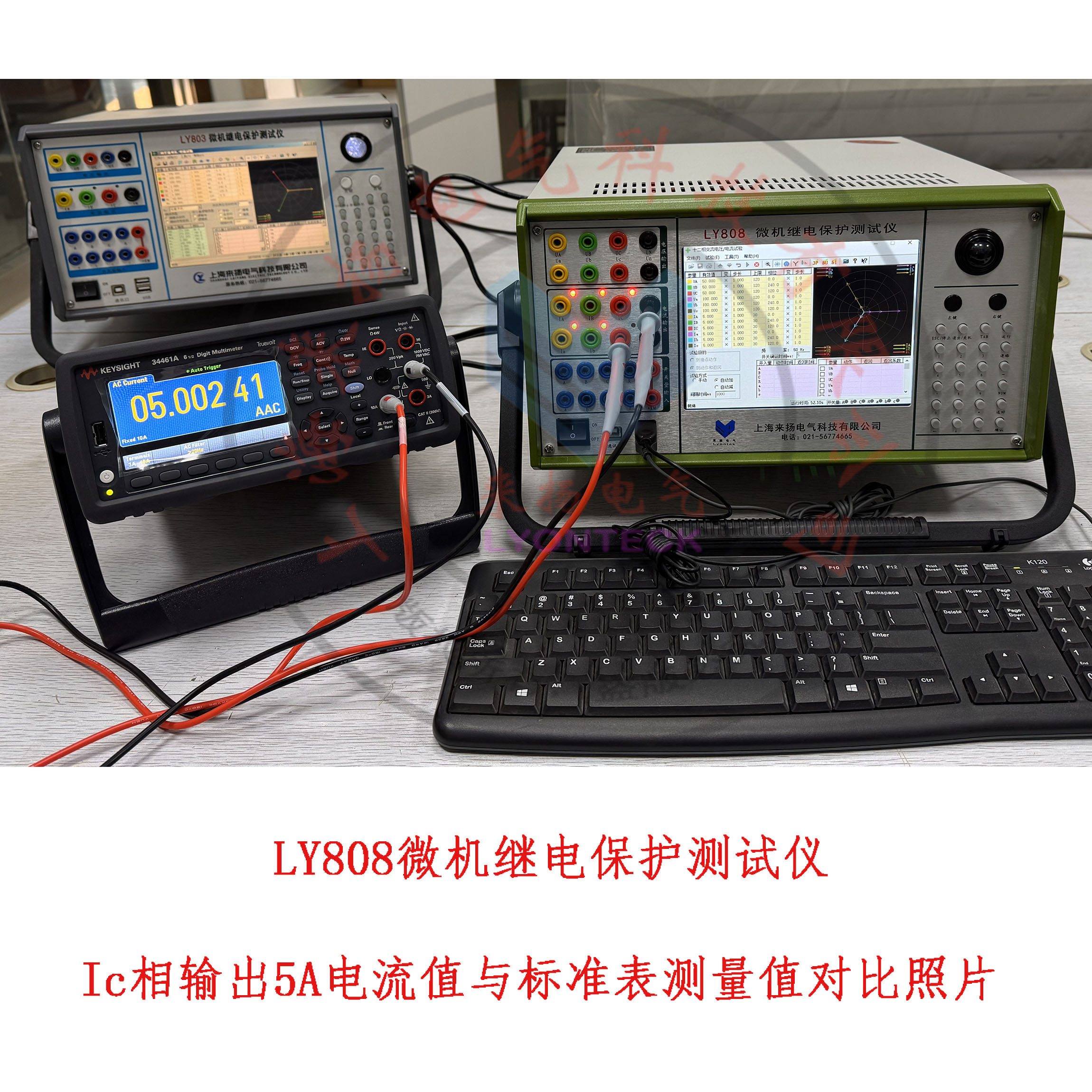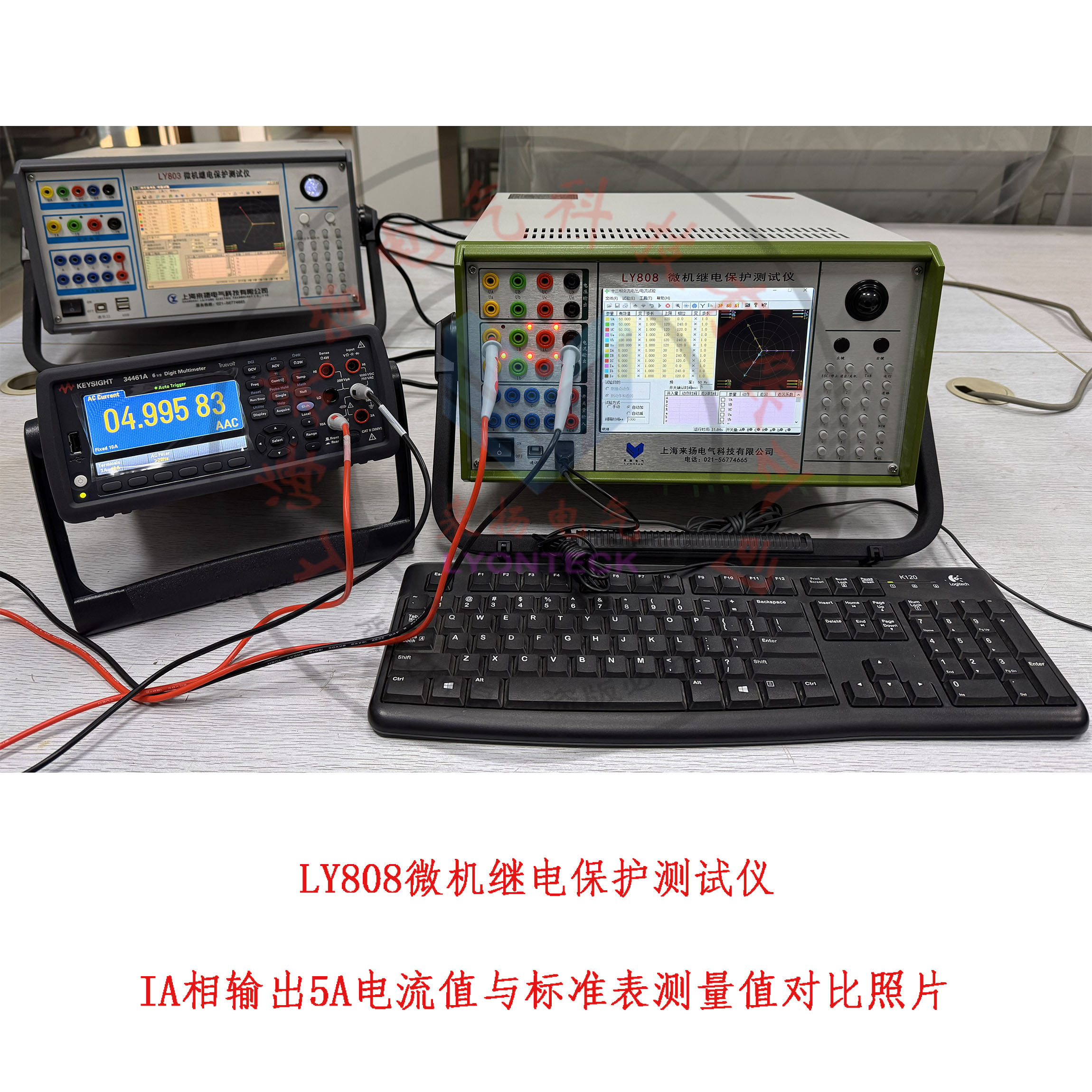 测试项目一(A相电流):上图LY808继保仪界面,电流输出端口A相输出交流5.000A的值,美国进口“是德牌(安捷伦)"6位半的标准表测量得到的实际值04.99583A,相差0.005A,计算实际偏差-0.1%,优于行业标准及国家标准的规定0.2%偏差。