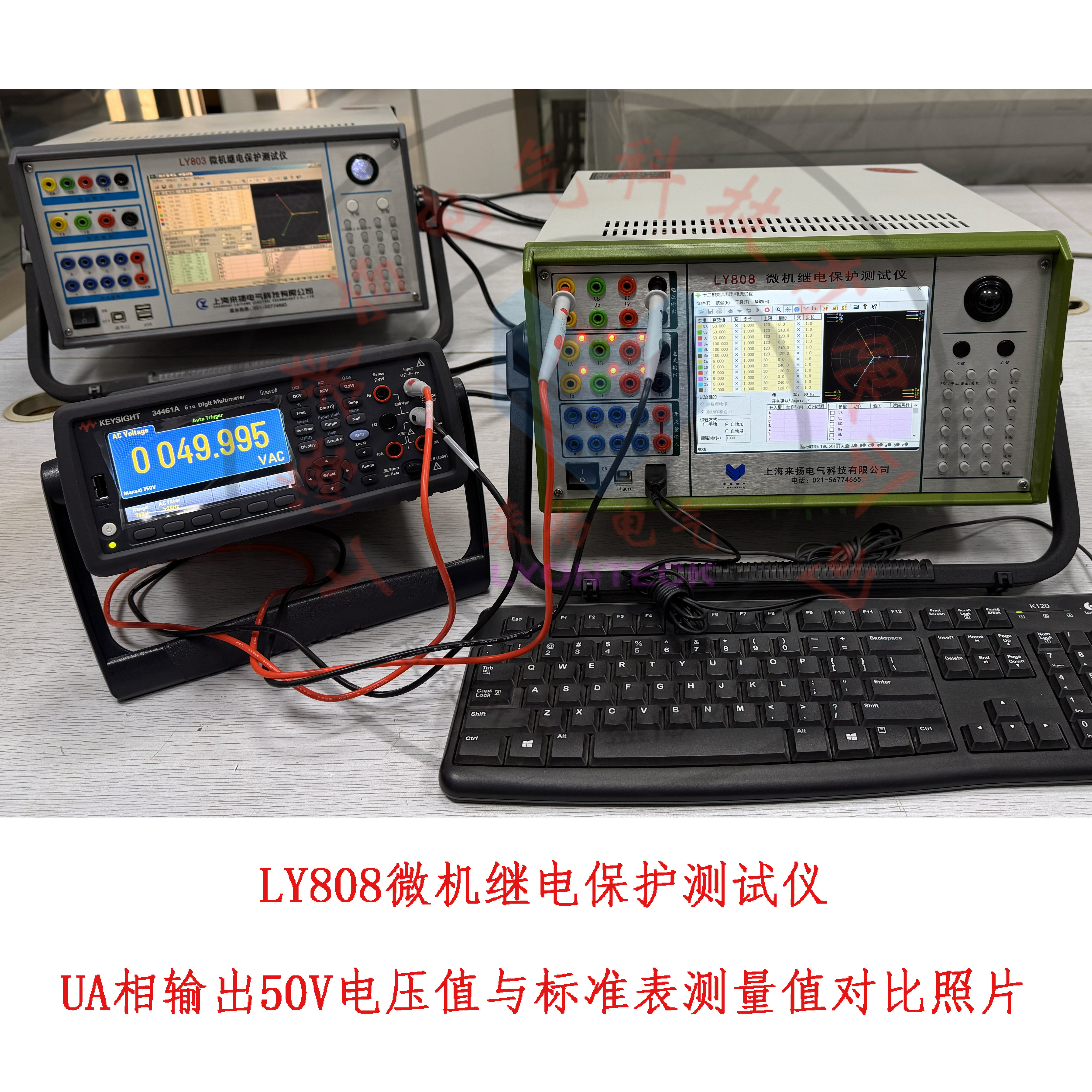 测试项目七(A相电压):上图LY808继保仪界面,电压输出端口A相输出交流50.000V的值,美国进口“是德牌(安捷伦)"6位半的标准表测量得到的实际值0049.995,相差0.005V,计算实际偏差-0.01%,优于行业标准及国家标准的规定0.2%偏差。