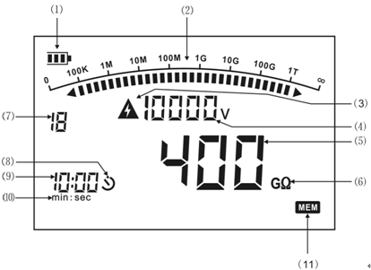 (3) | 高压告警 | 当仪表测试键按下并有高压输出时该符号点亮 |